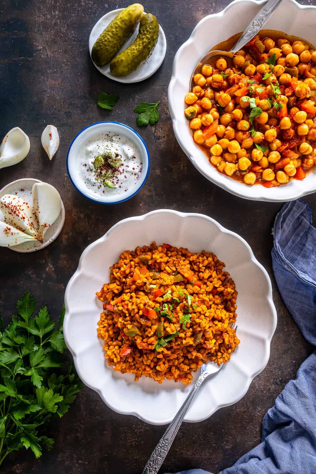 Bulgur pilavi is such a versatile side dish, it goes well with almost any meal. Our favorite pairings are with classic Turkish stews like kuru fasulye (bean stew), nohut yemeği (chickpea stew), taze fasulye (green beans), or Turkish beef stew.